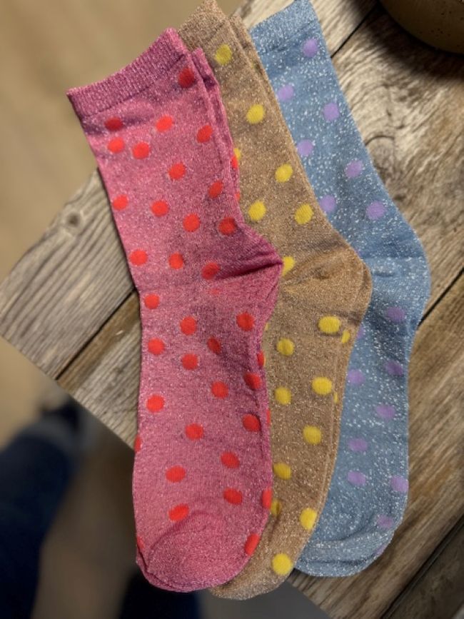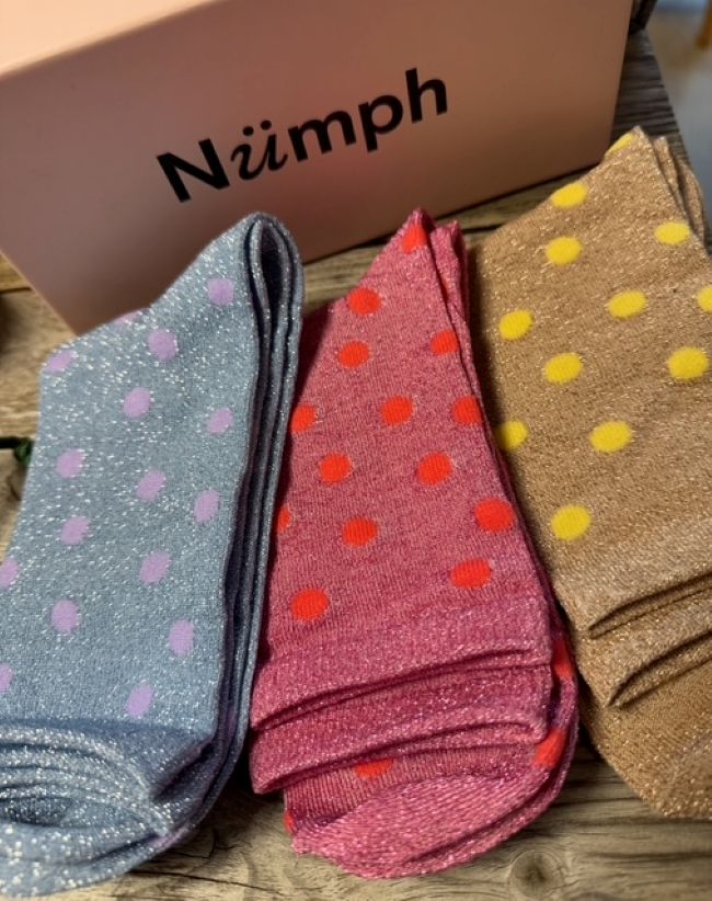 Strømper med glitter og prikker. NUSOPH SOCKS fra Nümph er festelige og kommer 3 par i en lyserød æske, så de er også rigtig fine som en lille gave. Alle 3 parstrømper har forskellige farver og prikkerne har også forskellige farver. De er onesize og passer ca. str. 36-41. Pakken er fin som en værtindegave.