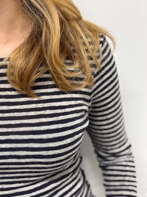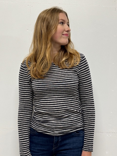 By Basics blusbar langærmet bluse med rund hals og rå kanter i 100% merinould. Vi er vilde med denne model her i Læsøshoppen og har den i mange farver og striber.