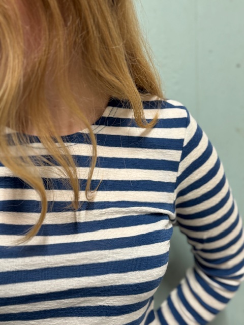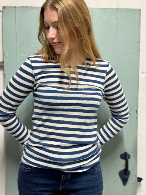 By Basics blusbar langærmet bluse med rund hals og rå kanter i 100% merinould. Vi er vilde med denne model her i Læsøshoppen og har den i mange farver og striber.