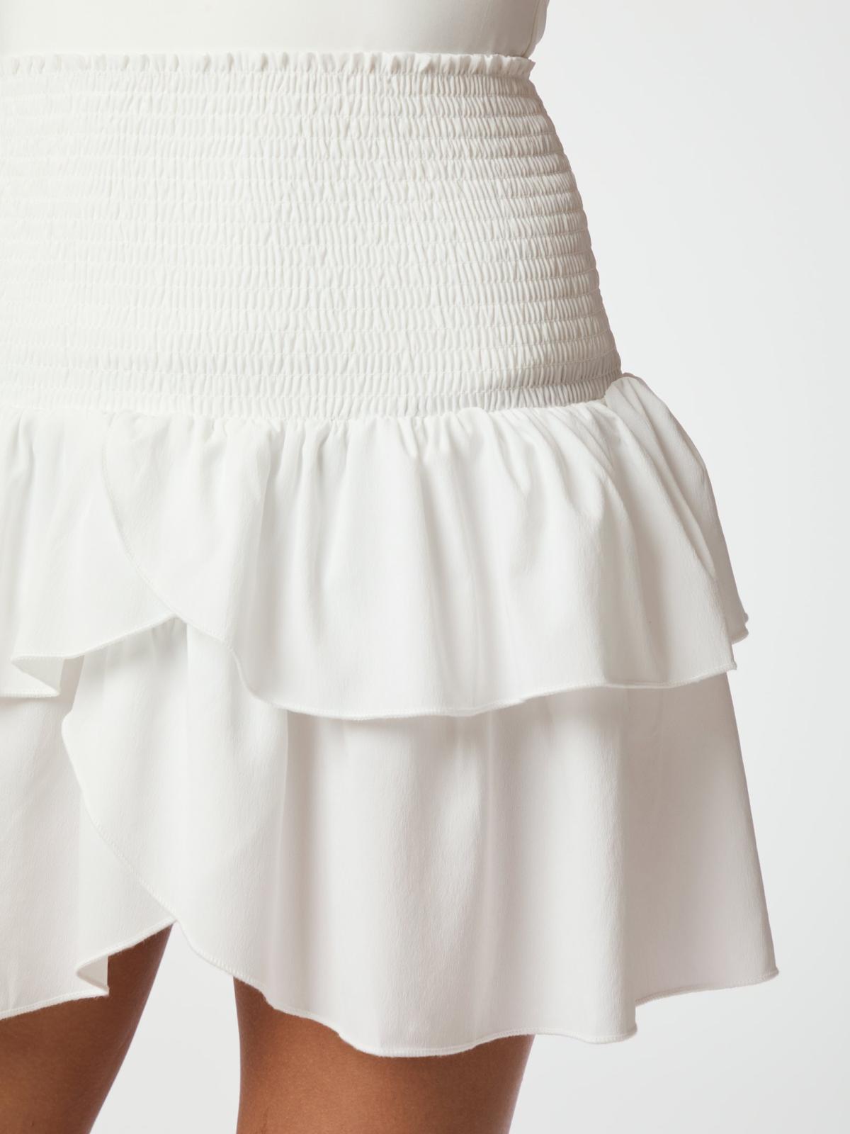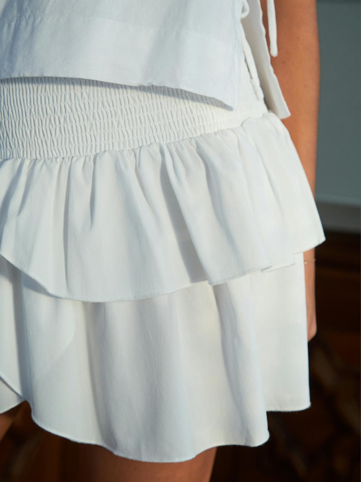 Fin, feminin og sommerlig kort nederdel med et let og elegant fald. Nederdelen er designet med to lag, som giver smuk bevægelse, og en diskret slids foran, der tilfører et sofistikeret twist uden at bryde det rolige udtryk.