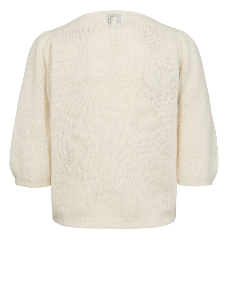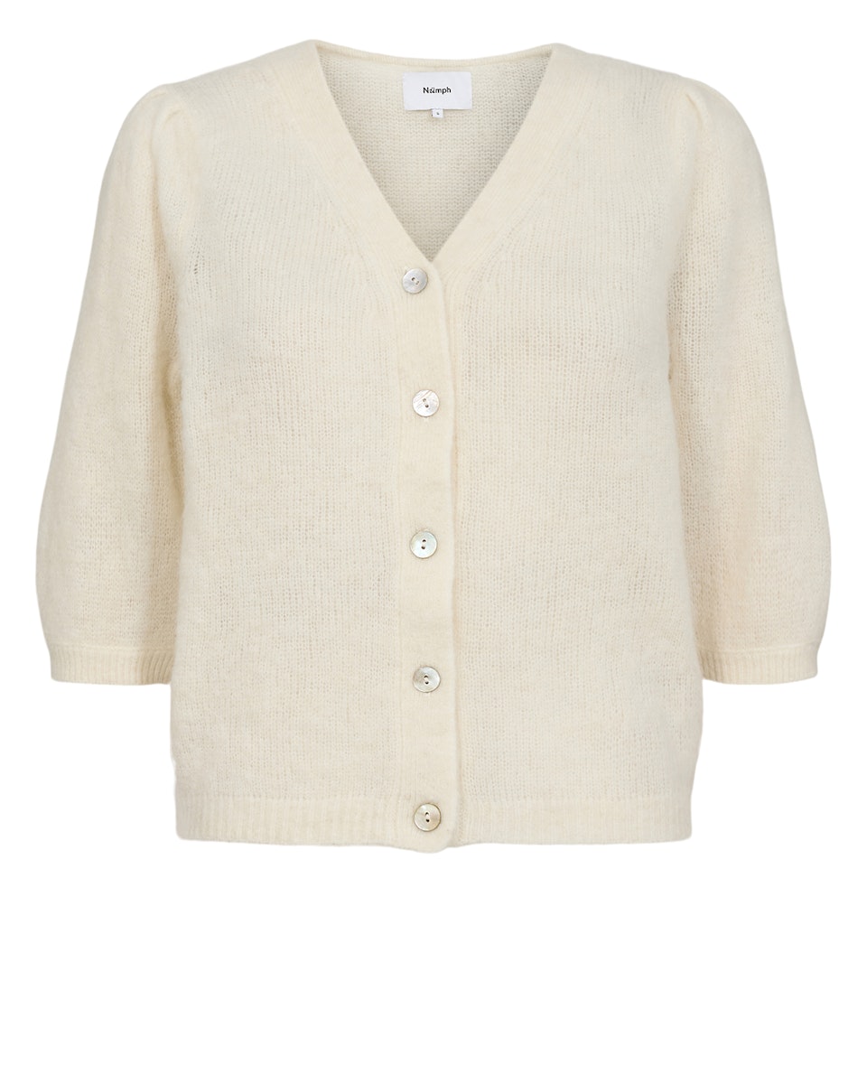 Blød og let cardigan fra Nümph i en neutral hvid nuance. Cardiganen har v-hals og 5 knapper ned foran. Den har 3/4 ærmer og der er rib ved alle kanter. Fås også i en rosa farve.