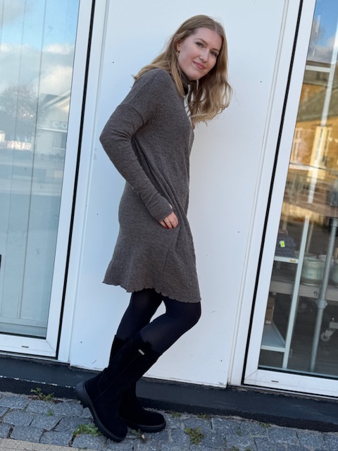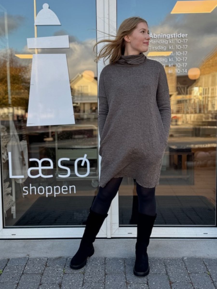Cool kjole i den flotte bubble wool kvalitet i 100% blød merinould. Kjolen har en løs rullekrave og en løs pasform. Den har lange ærmer og skjulte sidelommer. Flot med en ulden strømpebuks og et par støver eller sneaks eller og over et par jeans. Billedet med kvinden er for at du kan se modellen på - det er ikke den rigtig farve, hun har på.