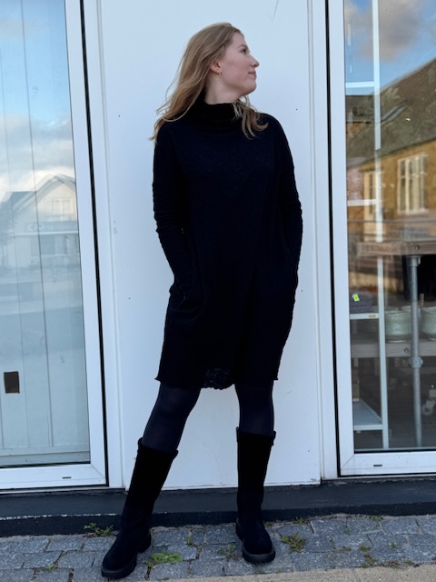 Cool kjole i den flotte bubble wool kvalitet i 100% blød merinould. Kjolen har en løs rullekrave og en løs pasform. Den har lange ærmer og skjulte sidelommer. Flot med en ulden strømpebuks og et par støver eller sneaks eller og over et par jeans. Billedet med kvinden er for at du kan se modellen på - det er ikke den rigtig farve, hun har på.