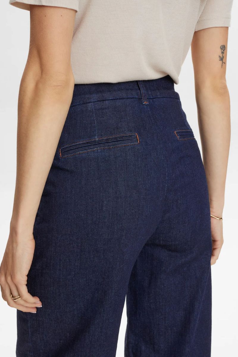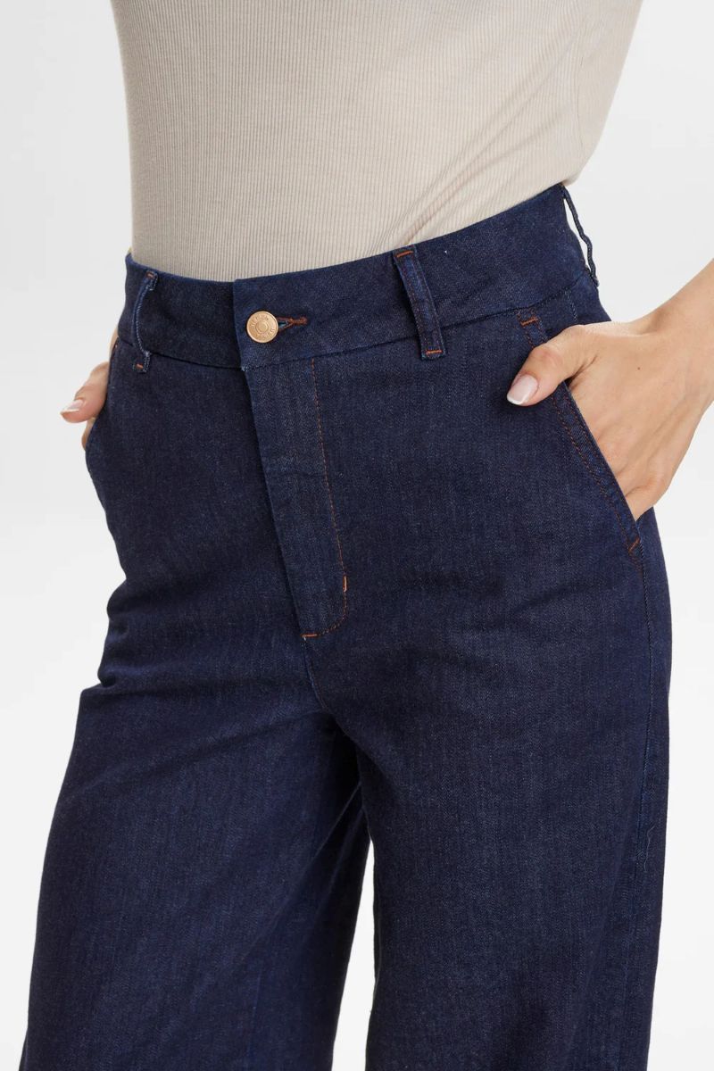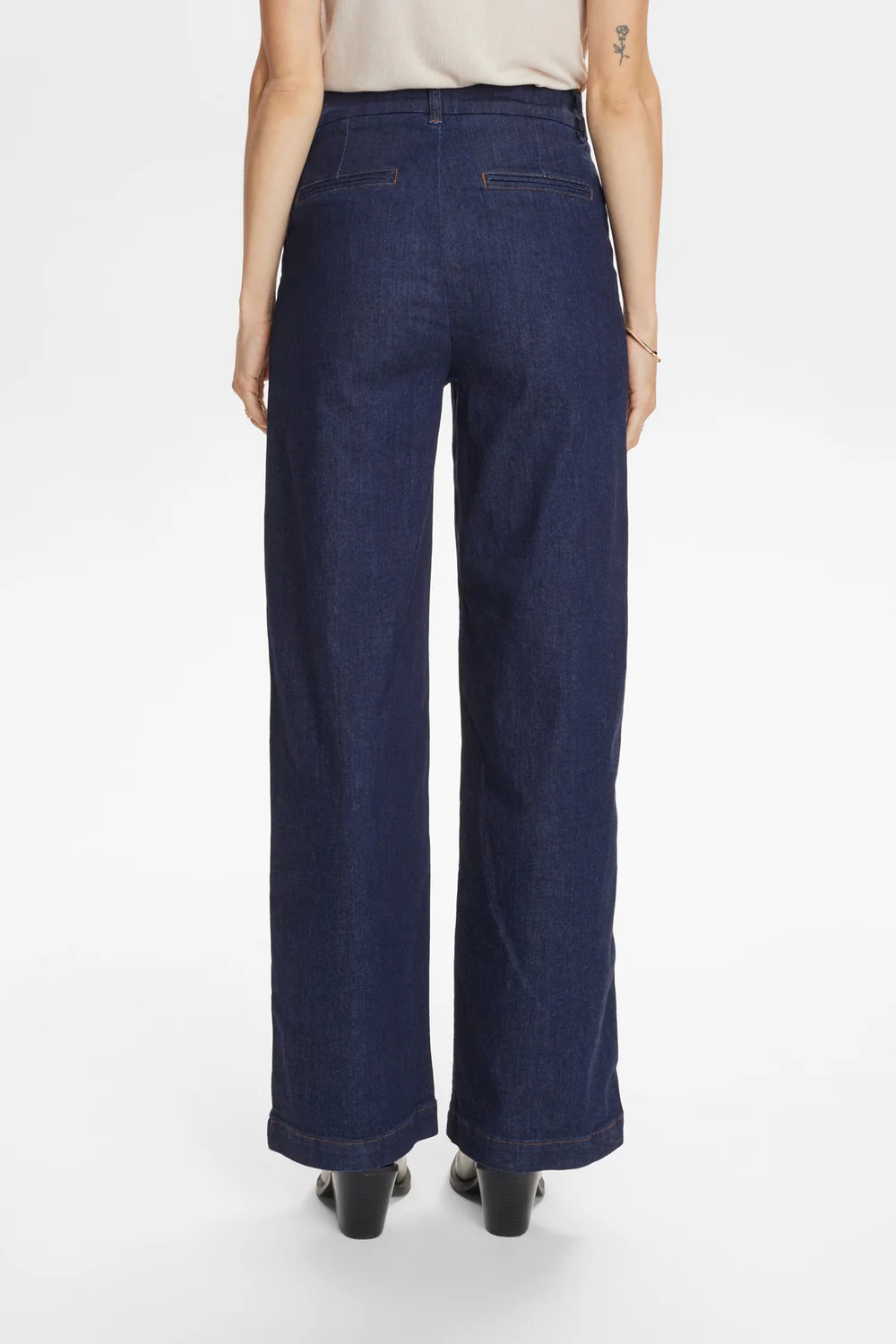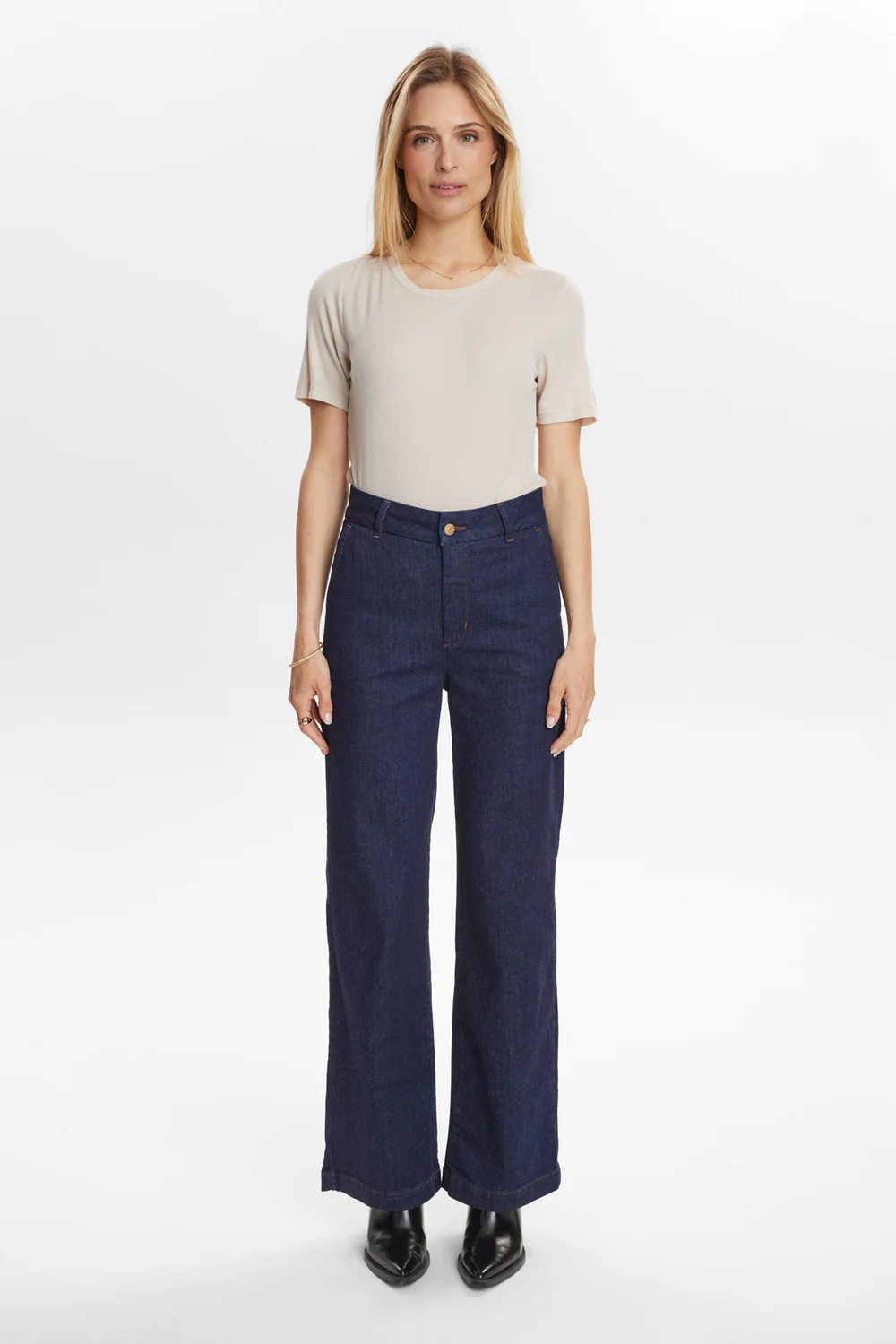 Denne jeans fra danska Nümph er en meget populær og velsiddende buks.  NUAMBER PANTS har høj talje og brede ben. En tendens der fortsætter. Disse jeans har skrålommer og snydelommer bagpå. Der er fastlinning med bæltestropper. Her er den kommet i en mørkeblå farve. Den har ankellængde, noget som passer godt til støvler og hvis du generelt gerne vil vise dine sko.  Vi er glade for jeans fra Nümph og denne model sidder virkelig godt.