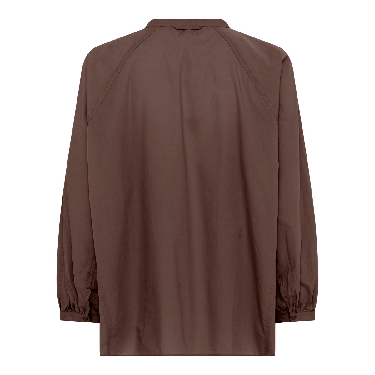 Oversized skjorte i 100% økologisk bomuldspoplin. Skjorten har kinakrave, lange ballonærmer med raglansnit, gennemknappet og pasformen er løs, hvilket gør skjorten rummelig og giver et afslappet udtryk. Om vinteren er den god at style med en langærmet t-shirt - fx en af dem vi har fra By Basics i 100% merinould.