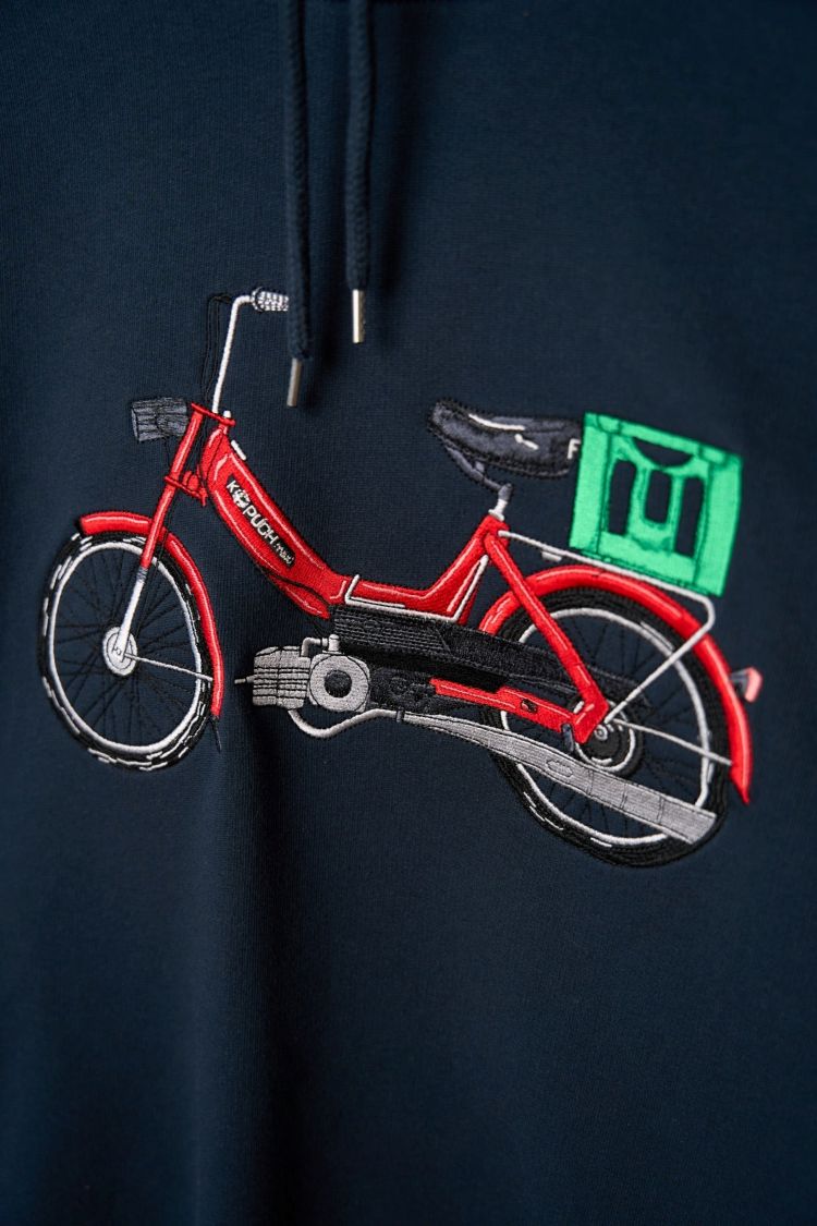En skøn hoodie med et skønt broderie af en rød Puch Maxi med den rigtige grønne mælkekasse på. Red Maxi Hoodie har lange ærmer, sidelommer og en hætte med justerbar snøre. Den kommer i en dejlig blød kvalitet af 100% bomuld. Lakor laver mest tøj til mænd, men kvinder må da gerne købe det - eller hugge fra manden.
