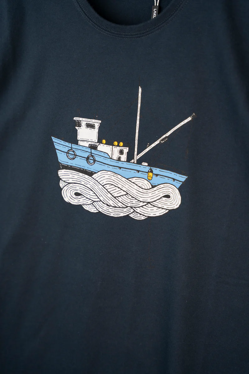 En mørkeblå T-shirt med en fiskerkutter i bølgerne. En hyldest til dem, der sætter livet på spild, or at vi andre kan spise sild.