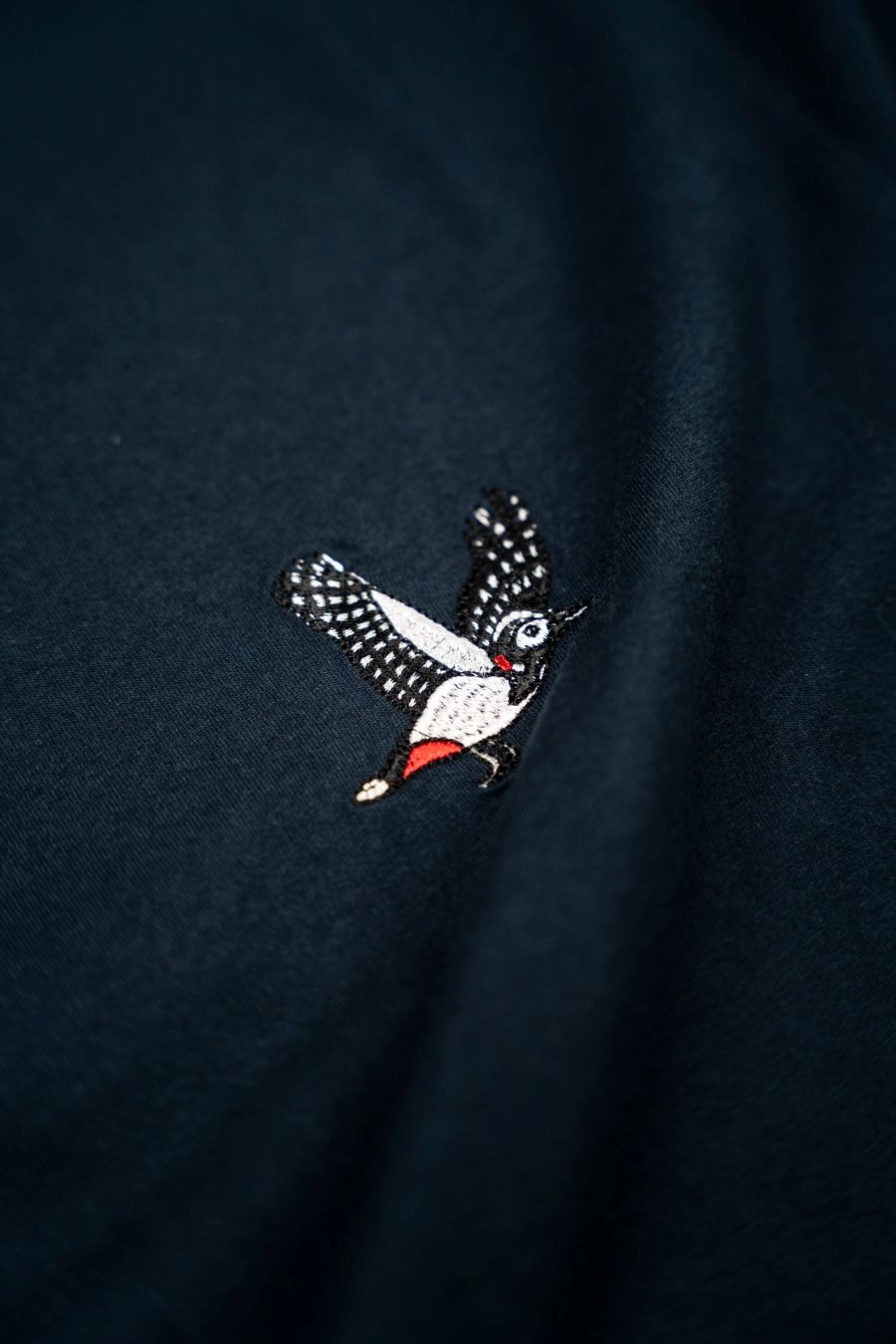 Den fascinerende spætte er her på en mørkeblå T-shirt. Et mindre broderet motiv med mange detaljer.
