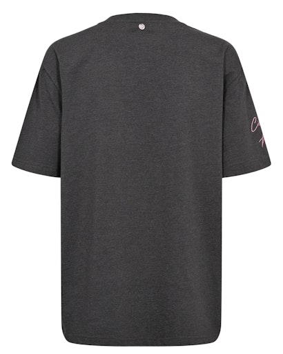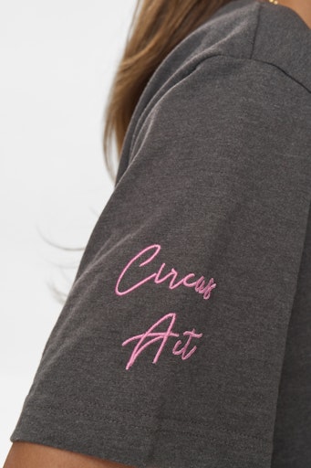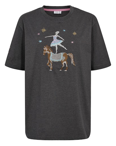 Mørkegråmeleret T-shirt med et skønt broderi i cirkus-tema. T-shirten er oversize og printen er bare så fint. Fin til til jeans og nederdel og under en blazer.