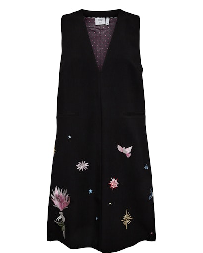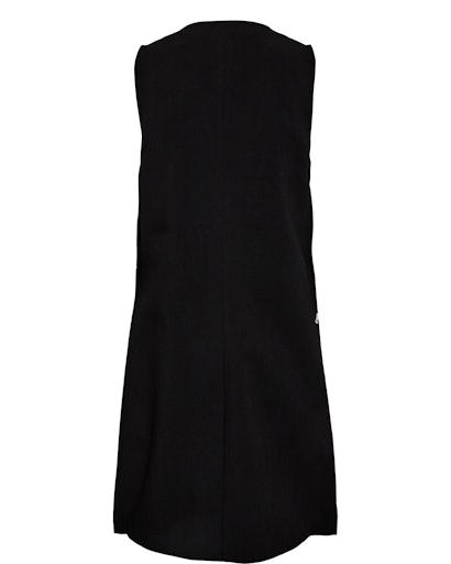 Sort kjole uden ærmer og med v-hals og 2 paspolerede lommer på fronten. Nederst på kjolen er der fine og farverige broderier inspireret af cirkus-livet. Der er et småprikket foer i kjole og den et let a-shape. En kjole som er nem at bruge med en langærmet bluse under - det kunne være en mesh eller en bomuldsbluse, men kan også bruges med en hvid skjorte under. Til forår og sommer kan den fint bruges uden noget under.