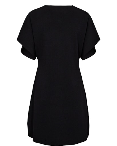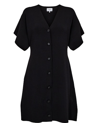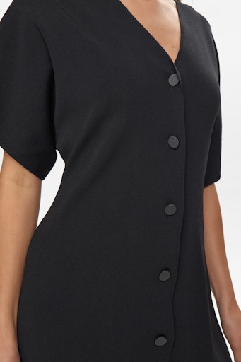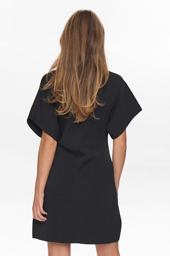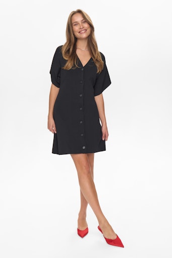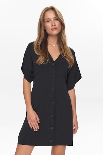 Sort kjole i en lækker strikkvalitet, som er fast i stoffet. Kjolen har ret enkel med v-hals og gennemknappet med sorte knapper ned foran. Ærmerne er dropdown og kjolen er fittet og sidder bare godt. En kjolen der vil være skøn med et far lange støvler til og som nemt kan styles op med smykker.