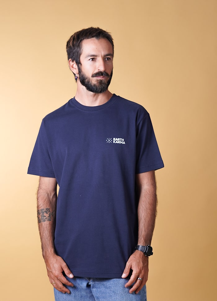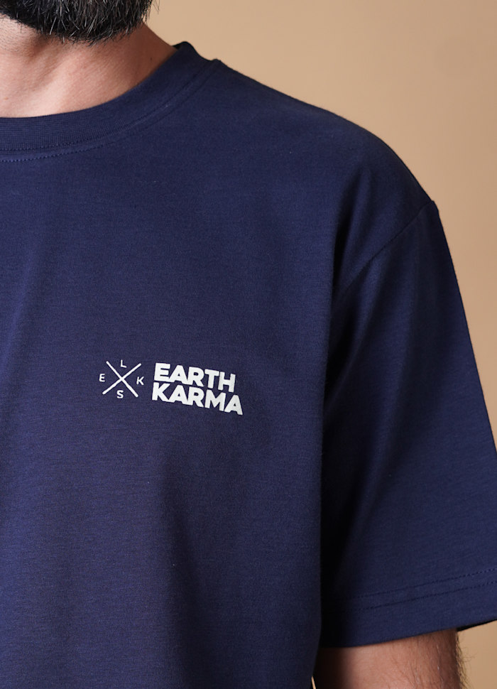 På brystet er der et lille, stilrent logo med teksten “Karma for jorden” og ELSK-bogstaverne i et kryds, som giver T-shirten et roligt og moderne udtryk.