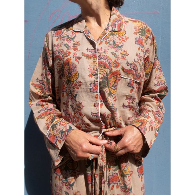 Denne pyjamas er et velkendt og ikonisk design fra Craft Sisters. Pyjamassen er med håndlavet blokprint, som er en ældgammel teknik, hvor blokke af træ dyppes i naturlige farver og presses mod stoffet og skaber flotte mønstre. Den er syet i Indien. Modellen kommer i flere farver og prints. Pyjamassen er i en løs pasform og i 2 størrelser. Bukserne er med brede ben, en kant forneden, elastik i taljen og en løbebånd. Skjorten er med almindelig skjortekrave, gennemknappet foran, ærmer med let vidde og en lomme på brystet. Materialet er 100 % bomuld. Pyjamassen kommer i en lille stofpose i samme print.