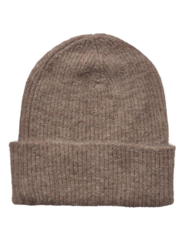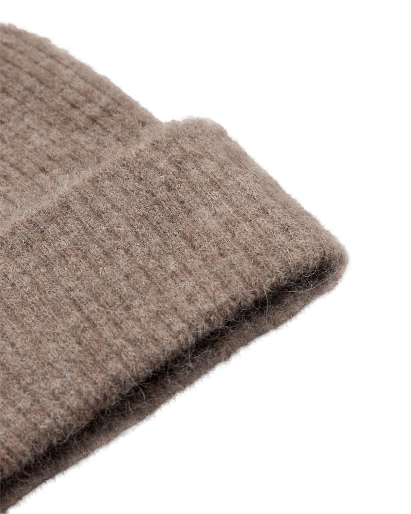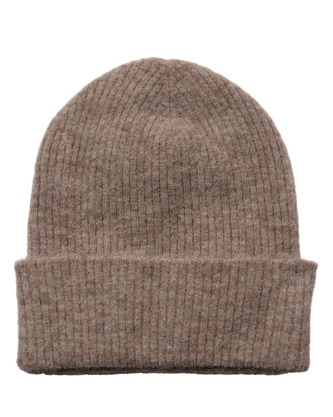 En blød og varm hue strikket i rib og i en smuk, rolig taupegrå farve. Huen har et justerbart opsmøg, så du kan tilpasse højden efter behov. Den er behagelig at have på og holder godt på varmen – perfekt til de kølige måneder.