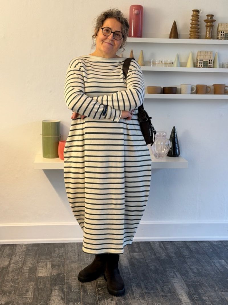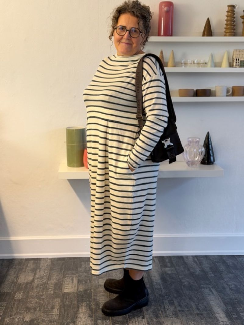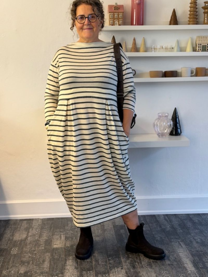 Her ses den i farven raw white/asphalt, hvor den rene offwhite nuance kombineres med en fin, stribet kontrast. En stilfuld kjole, der klæder de fleste og kan bruges både til hverdag og pænere anledninger.
