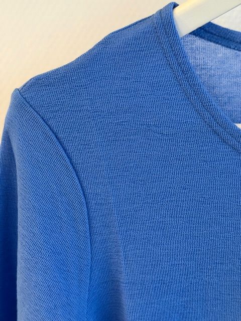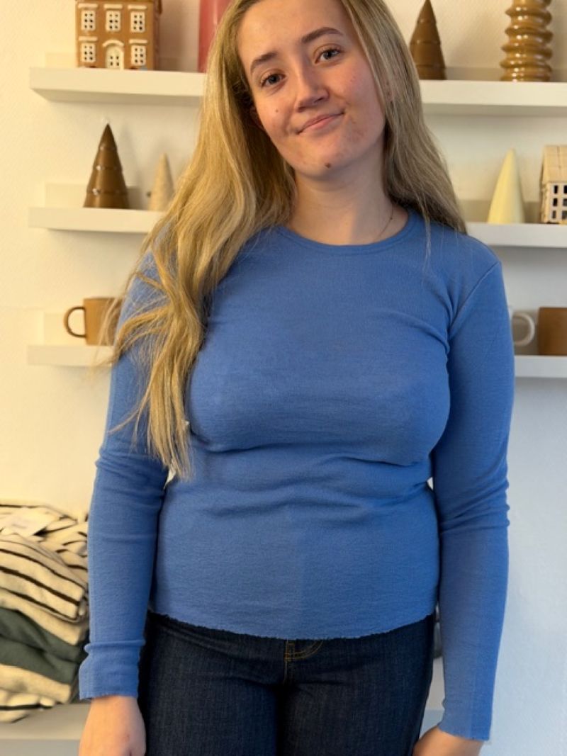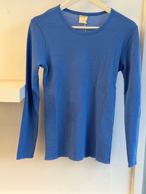 En langærmet bluse fra By Basics med rund hals og de karakteristiske rå kanter, som giver et let og moderne udtryk. Den er strikket i 100% blød merinould og er én af vores absolutte favoritter her i Læsøshoppen – derfor har vi den også i mange farver og stribede varianter.