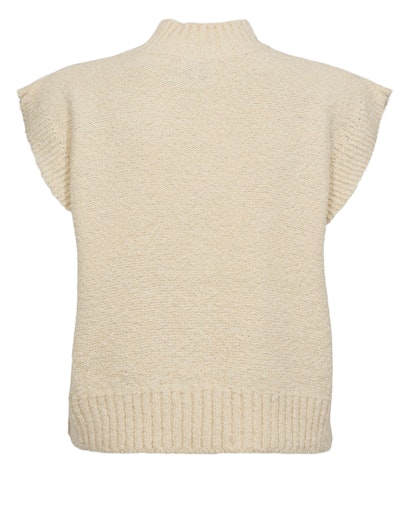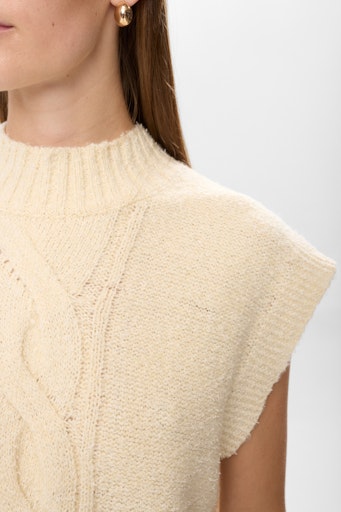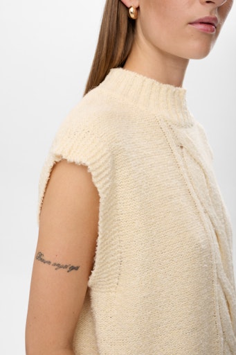 En strikket vest med en smuk, levende struktur og en bred snoning på fronten, som giver et markant og stilfuldt udtryk. Vesten har ribkanter hele vejen rundt og en høj hals, der fuldender det moderne look.