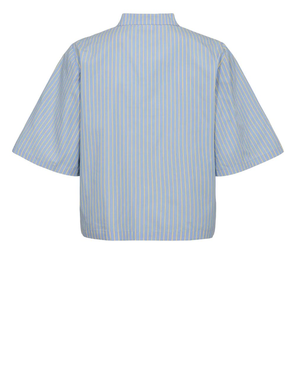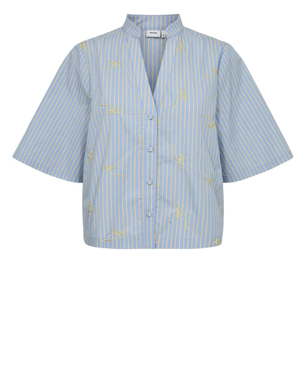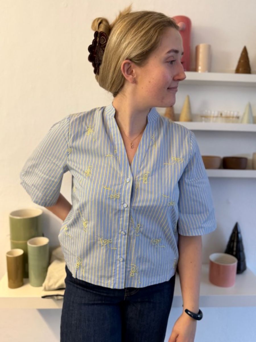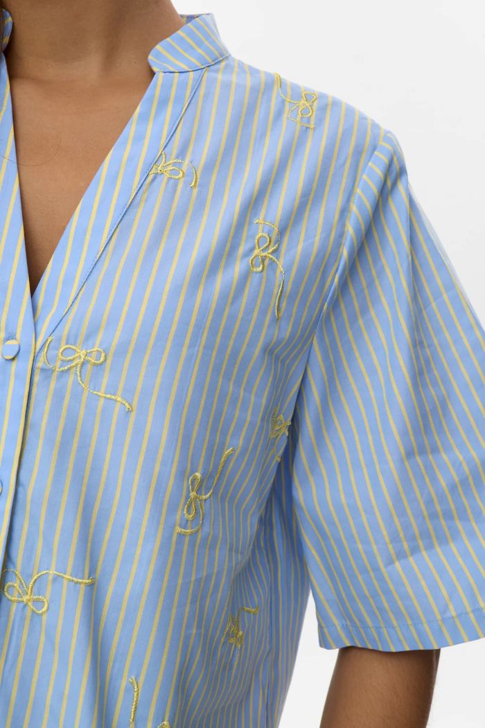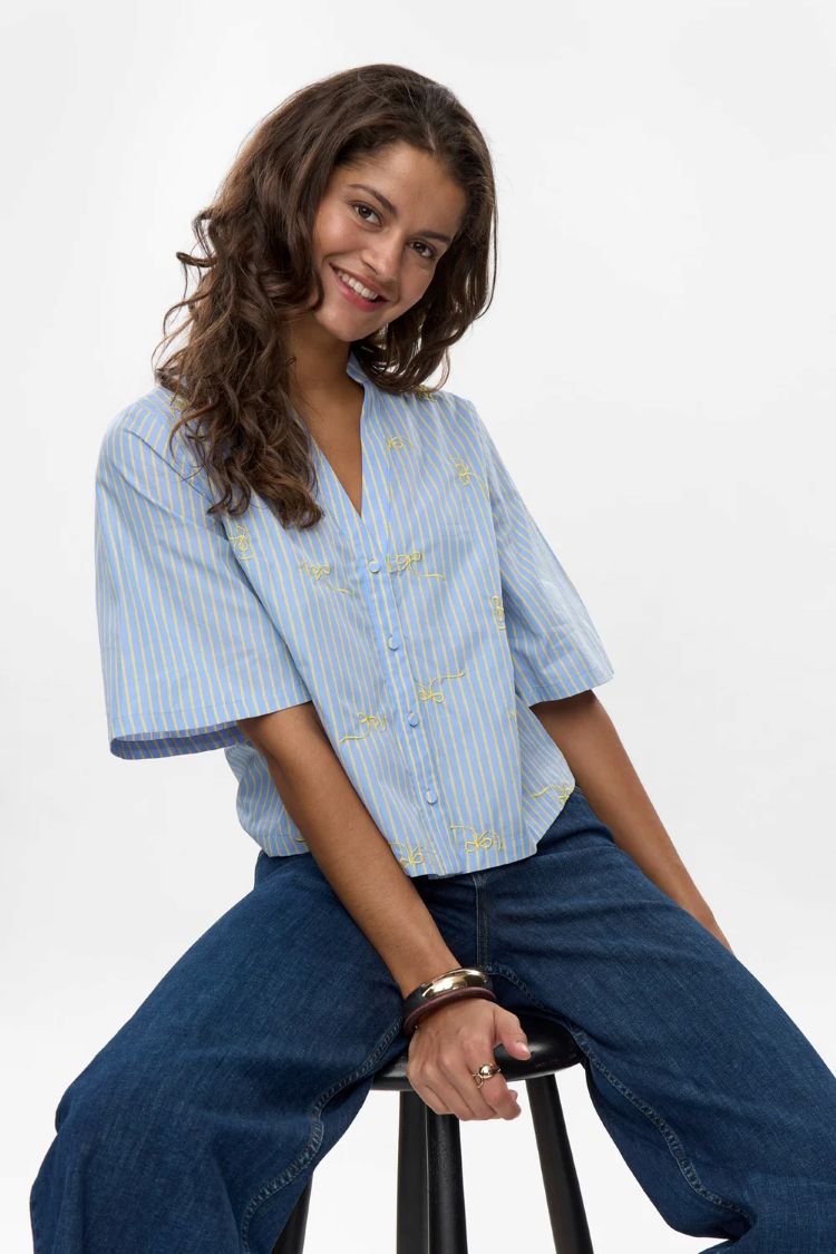 En let og fin skjorte i lyseblå striber, dekoreret med små broderede gule sløjfer, der giver et feminint og legende udtryk. Skjorten har en lav krave, en elegant V-hals og stofovertrukne knapper hele vejen ned – en smuk detalje, der understreger det gennemførte design.