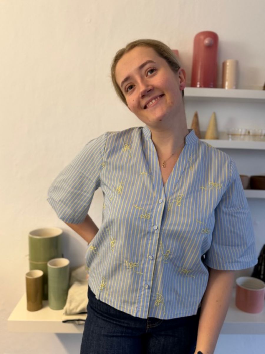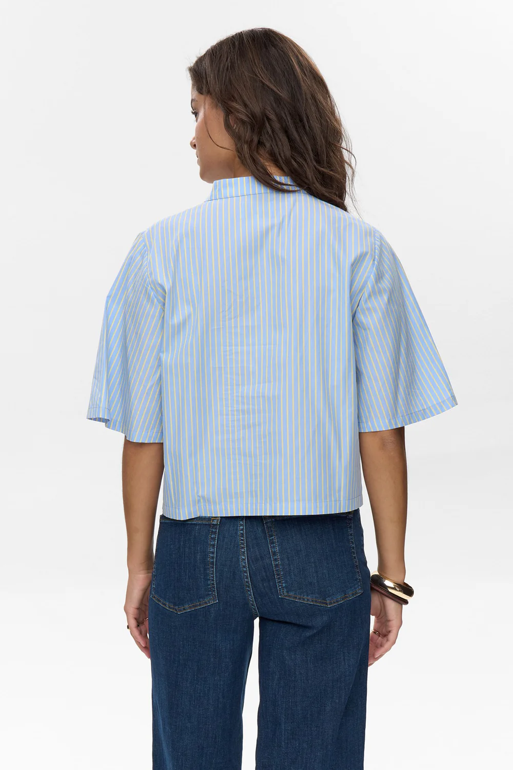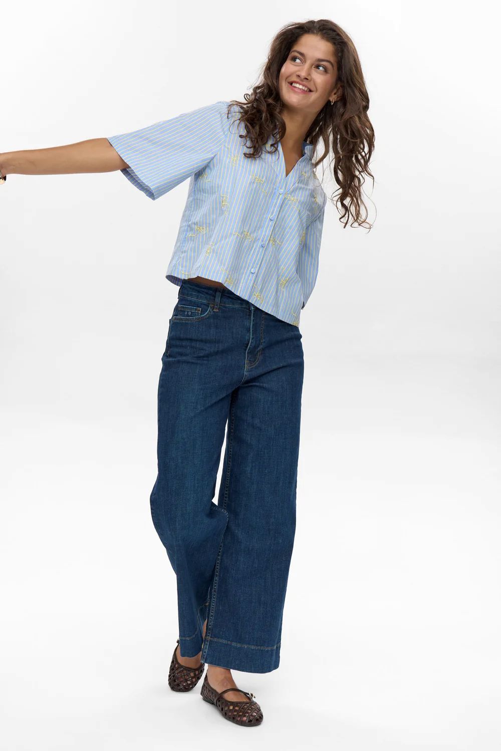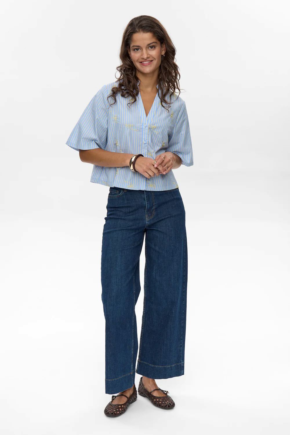 En let og fin skjorte i lyseblå striber, dekoreret med små broderede gule sløjfer, der giver et feminint og legende udtryk. Skjorten har en lav krave, en elegant V-hals og stofovertrukne knapper hele vejen ned – en smuk detalje, der understreger det gennemførte design.