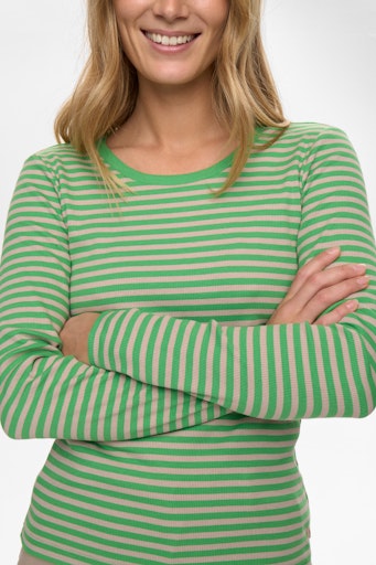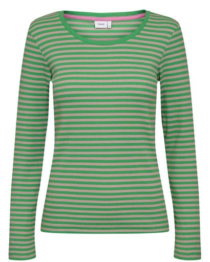 En alsidig, langærmet T-shirt med striber, som er nem at bruge hele året. NUMELANY LS BLOUSE fra Nümph er designet med rund hals og lange ærmer og syet i en blød bomuldsblanding med elastan, der sikrer en behagelig pasform og let stretch.