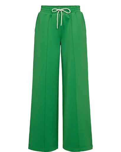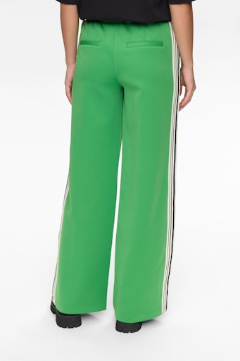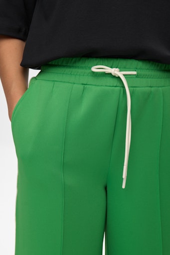 Langs den udvendige sidesøm løber en bred piping med striber i hvid og sort – en sporty og stilfuld detalje, der giver bukserne kant og karakter. Den klare grønne farve gør dem nemme at style både enkelt og mere modigt, alt efter humør og anledning.