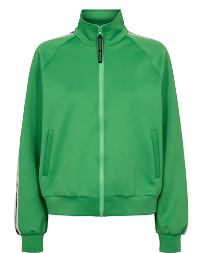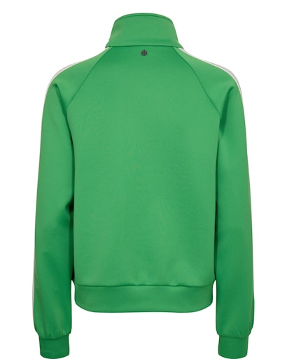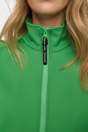 En cool cardigan med lynlås i en markant og frisk grøn farve, der virkelig giver dit outfit karakter. Cardiganen har lynlås hele vejen ned foran og en opretstående krave, som giver et sporty og moderne udtryk. De lange ærmer er dekoreret med en kontrastpiping i hvid og sort langs siden – en fin detalje, der skaber kant og sammenhæng i designet.