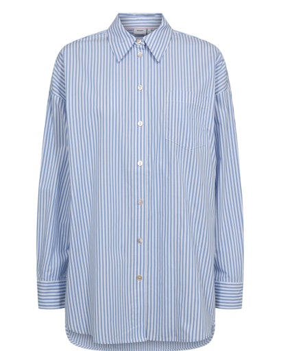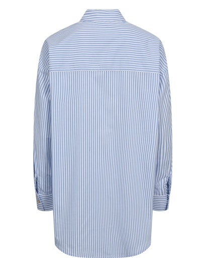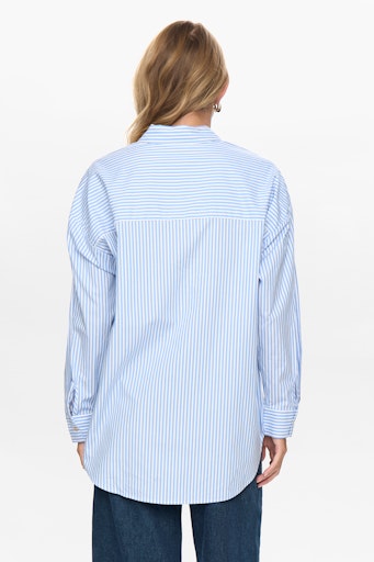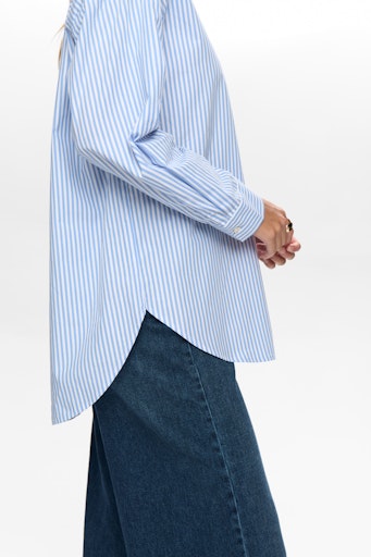 Smalstribet skjorte i friske blå og hvide nuancer, der giver et klassisk og samtidig afslappet udtryk. Skjorten har en traditionel skjortekrave og er gennemknappet foran med fine detaljer. Den enkle brystlomme understøtter det rene look, mens de lange ærmer afsluttes med manchetter. Pasformen er let oversize, hvilket giver et moderne snit og gør skjorten behagelig at have på – perfekt både lukket og brugt åbent over en T-shirt.