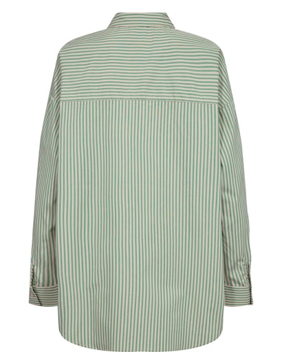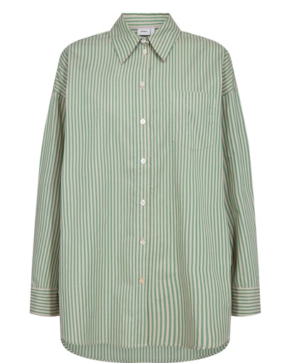 Smalstribet skjorte i smukke, naturlige nuancer af grøn og sand, som giver et roligt og tidløst udtryk. Skjorten har klassisk skjortekrave og er gennemknappet foran. Den enkle brystlomme understreger det rene design, mens de lange ærmer afsluttes med manchetter. Pasformen er let oversize og giver skjorten et afslappet, moderne snit, der gør den nem at style – både lukket for et mere klassisk look eller åben over en T-shirt.