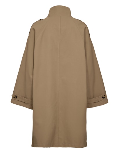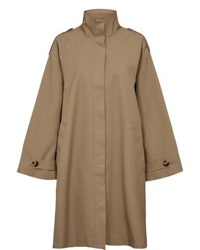 Cool og elegant frakke i en smuk beige nuance. Frakken har et enkelt, tidløst snit med skjult knaplukning foran, en høj og stilren krave samt lange ærmer med let vidde, der giver et moderne udtryk. På skuldrene og ved ærmeafslutningerne er der fine detaljer med brede stropper og knapper, som tilfører frakken karakter uden at tage fokus fra det rene design. De klassiske skrålommer gør frakken både praktisk og anvendelig i hverdagen.