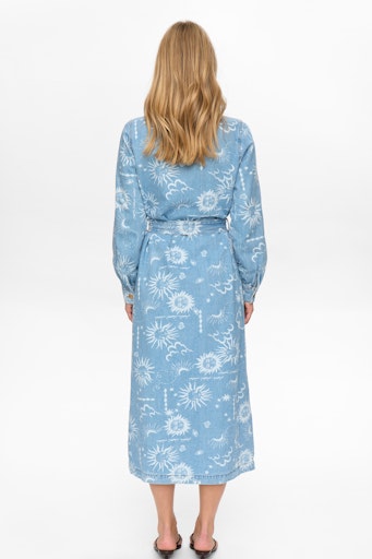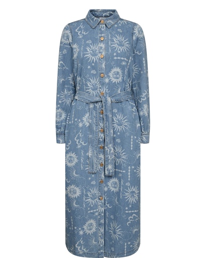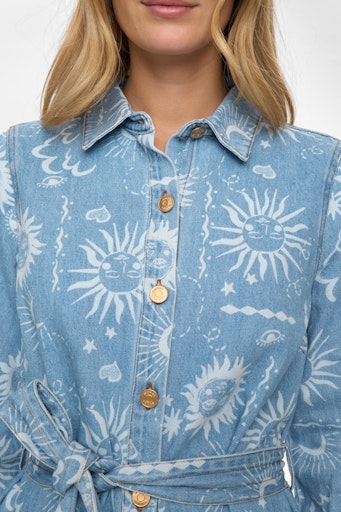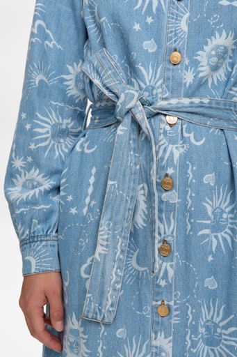 Denimskjortekjole med et smukt og karakterfuldt print. Kjolen har et klassisk skjortekjolesnit med traditionel skjortekrave og er gennemknappet foran med metalknapper, som giver et cool og tidløst udtryk. De lange ærmer afsluttes med manchetter, og i taljen medfølger et bindebånd, så du kan fremhæve figuren eller bære kjolen mere løst.