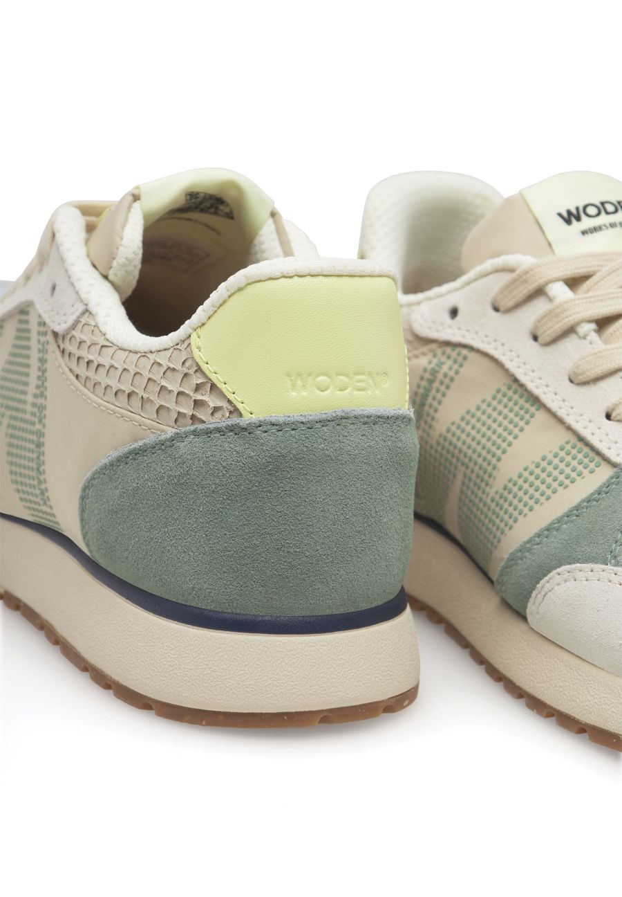 Ronja fra WODEN er en af brandets mest populære sneakers – og det forstår man godt. Modellen fås i flere smukke farvekombinationer, og denne udgave Wax Multi er en harmonisk sammensætning af lyse pastelfarver i grønne og beige nuancer. Farverne spiller elegant sammen og giver sneakeren et let, frisk og moderne udtryk. De beige snørebånd binder designet sammen og understøtter den rolige farvepalette.
