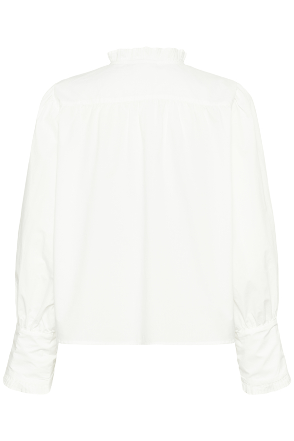 Ved skuldrene er der fine rynkedetaljer, som tilfører lethed og femininitet, og de lange ærmer har en smule volumen. Ærmerne afsluttes med en elegant manchet og en smuk sølvfarvet knap, der giver skjorten et eksklusivt touch. En klassisk og tidløs skjorte, der fungerer lige så godt til hverdag som til mere formelle anledninger.