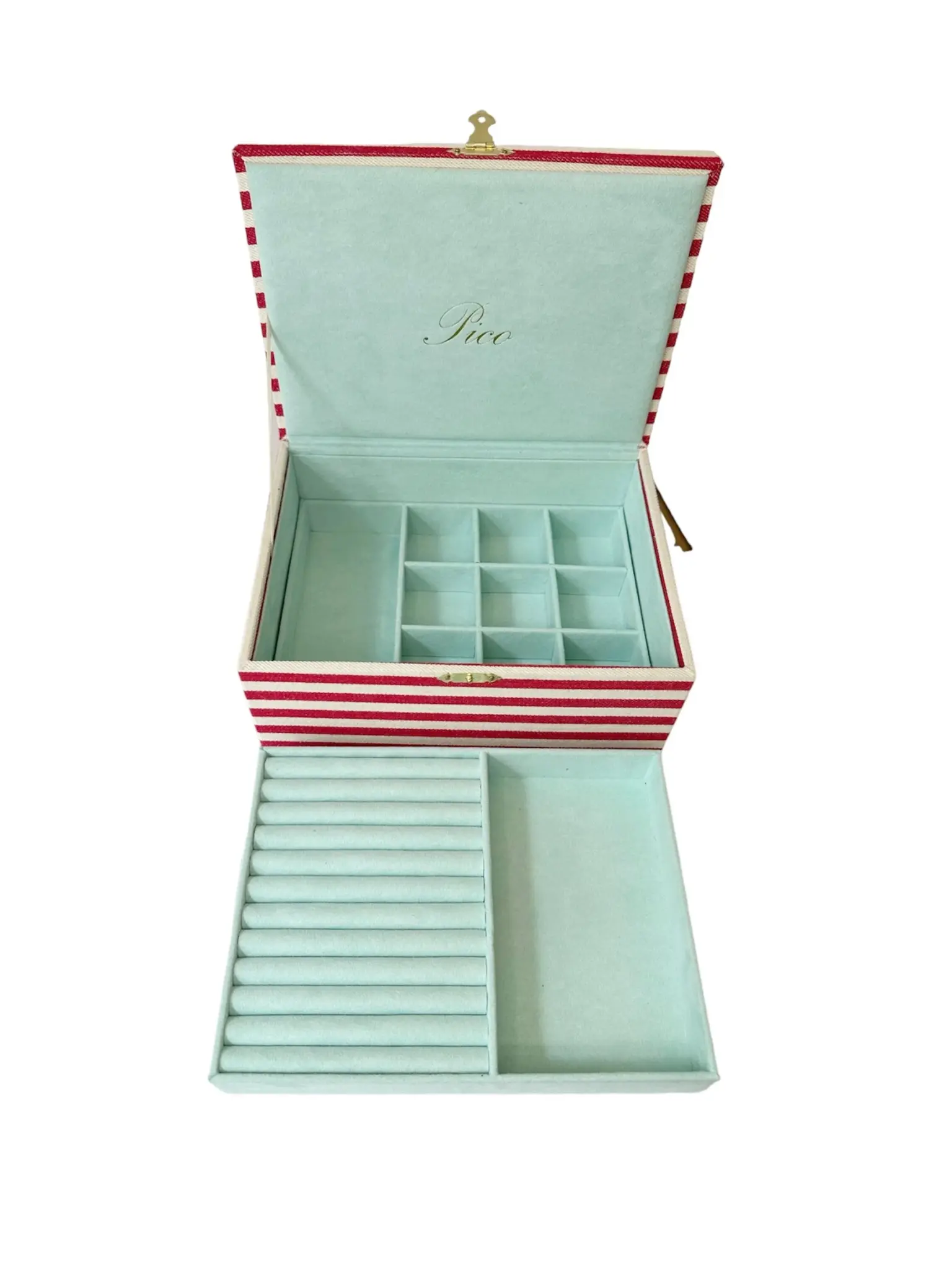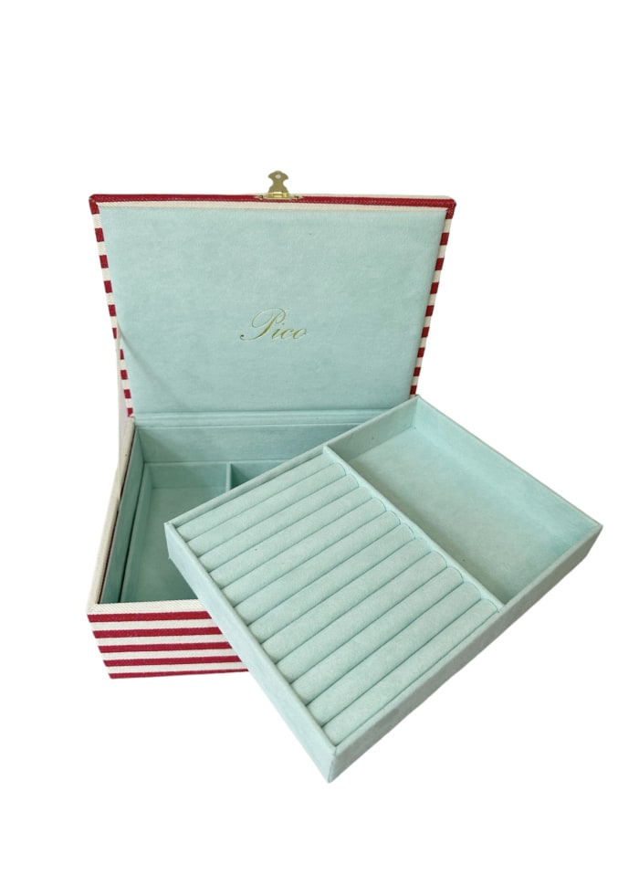 De fine navy striber på ydersiden giver smykkeskrinet et klassisk og elegant look, mens den bordeauxfarvede inderside tilfører en varm og eksklusiv kontrast. Et smykkeskrin, der både er praktisk i hverdagen og smukt nok til at stå fremme på badeværelset eller i soveværelset.
