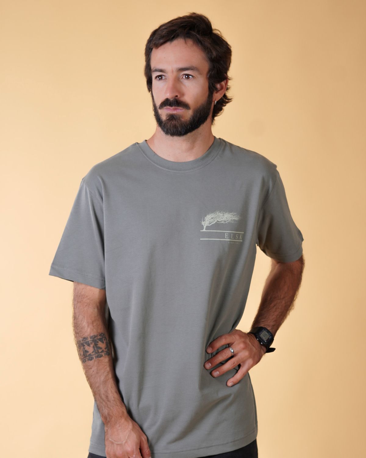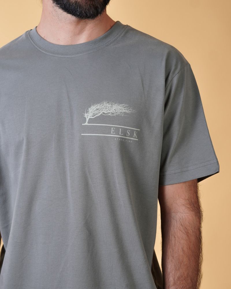 På brystet sidder et lille print med et vindblæst træ, som man kender det fra kysten. Under motivet står ELSK og med fin skrift teksten “STÆRK VIND”. Et stemningsfuldt print, der leder tankerne mod rå natur, Vesterhavet, åbne kyster og vildt vejr.