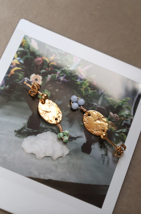 Fin og let ørestik med små lyseblå glasperler, der giver et sart og feminint udtryk. Ørestikken er smuk alene, men egner sig særligt godt til at blive mixet med andre øreringe for et personligt og legende look. Perfekt, hvis du har flere huller i ørerne og kan lide at kombinere på kryds og tværs.