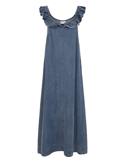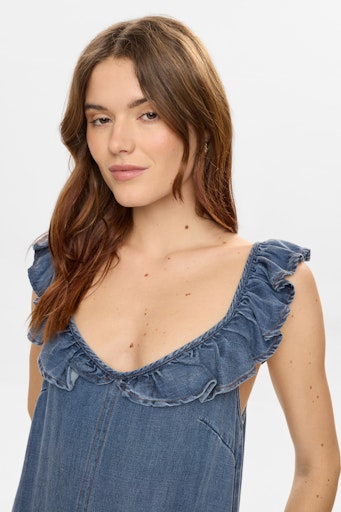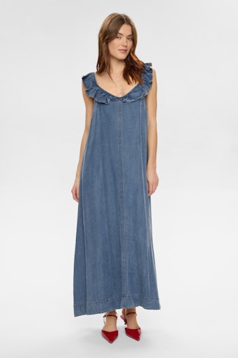 En rigtig sommerkjole til de lune dage, hvor det skal være let og ubesværet. Kjolen har maxilængde og et enkelt, feminint udtryk, der falder smukt omkring kroppen. Den runde halsudskæring er pyntet med en fin flæsekant, som giver et blødt og romantisk touch.
