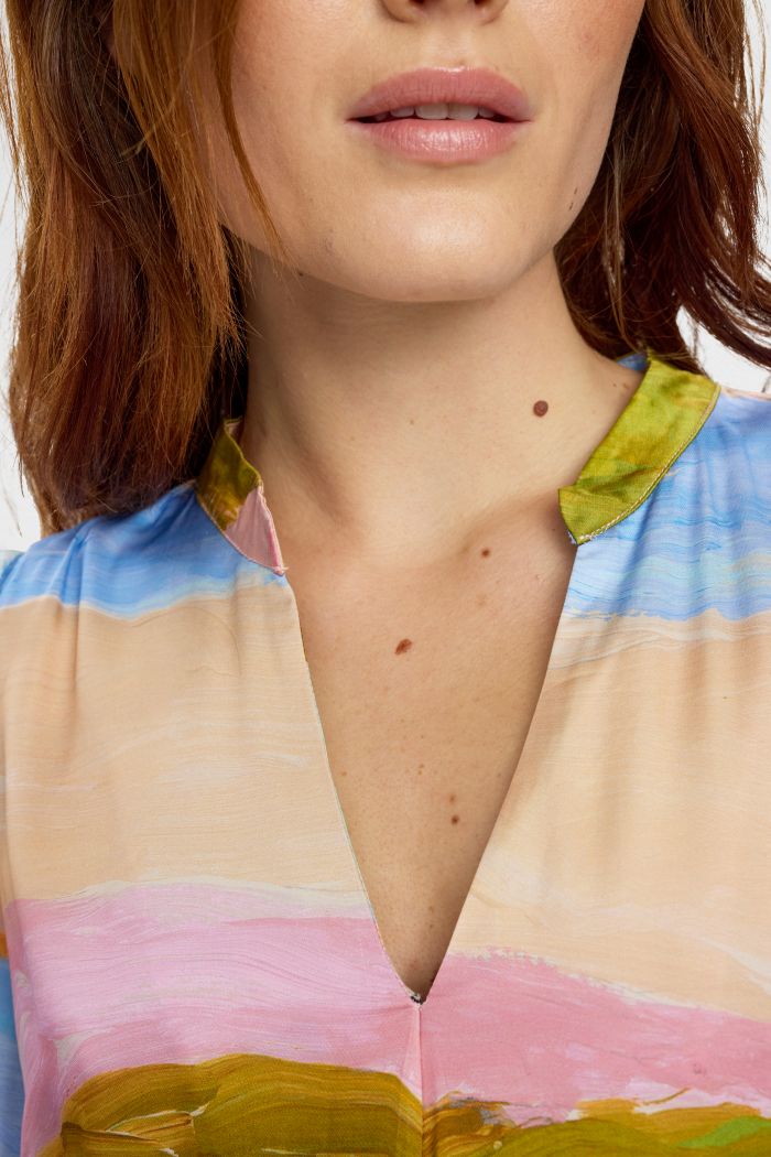 Materialet er 100% viskose, som falder let og smukt omkring kroppen. Længden er mellemlang og slutter lige over knæet, hvilket gør kjolen både anvendelig og behagelig i hverdagen. Den lave krave glider elegant over i en kort V-udskæring, og de korte ærmer med let vidde tilfører kjolen et luftigt og afslappet look.