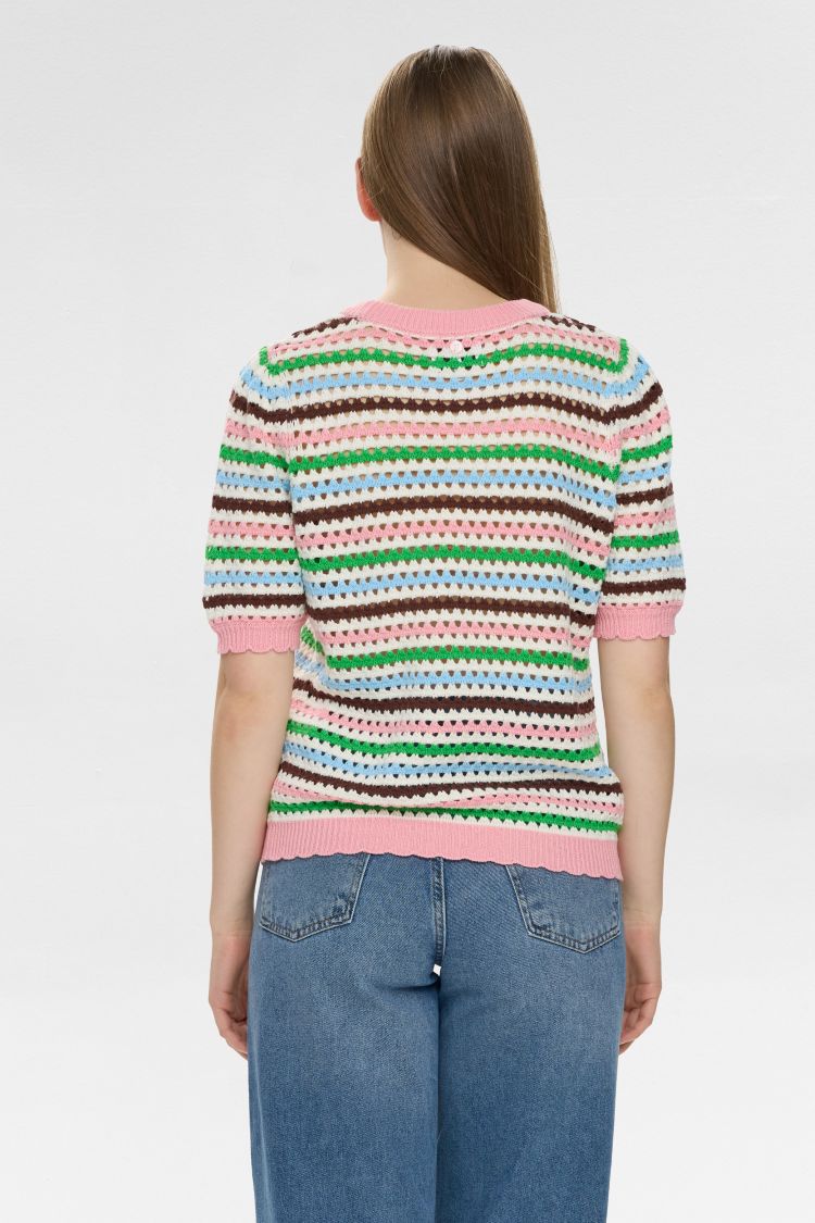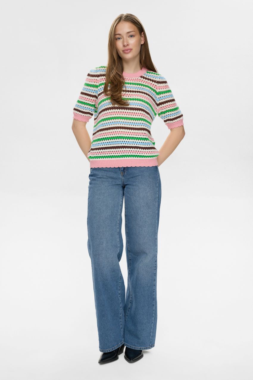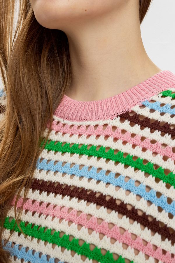 En flot og let strikbluse fra Nümph med skønne, farvede striber strikket i et dekorativt hulmønster, der giver blusen et levende og sommerligt udtryk. Strikken er lavet i 100% bomuld, hvilket gør den både blød, åndbar og behagelig at have på.