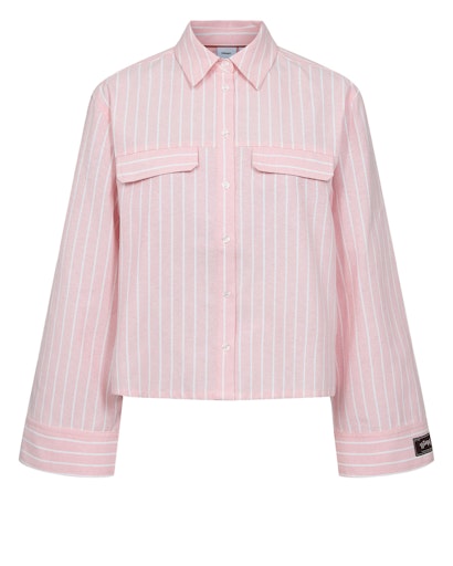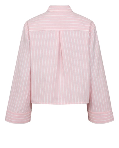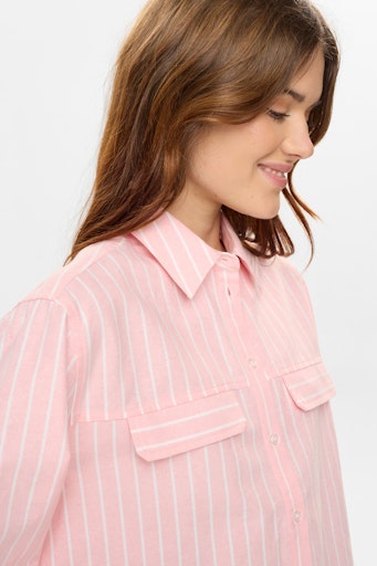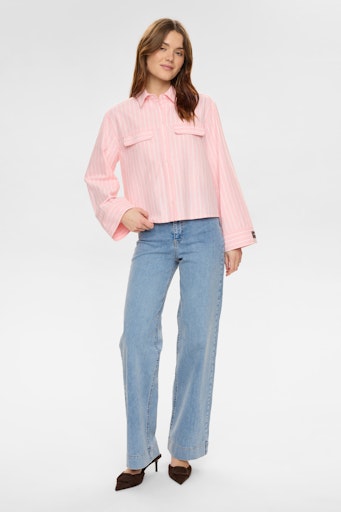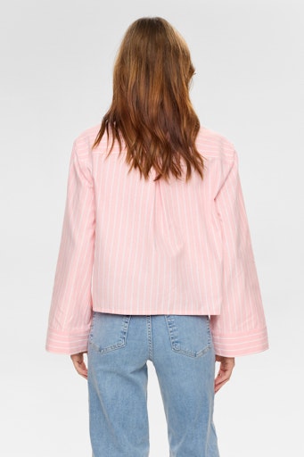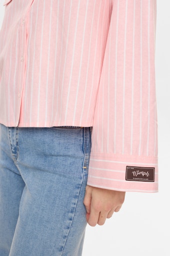 Strikket, kortærmet bluse fra danske Nümph i et feminint og let udtryk. Blusen er strikket med fine striber i selve strukturen, som giver dybde og et elegant spil i overfladen. Ribkanterne ved hals, ærmer og forneden matcher stribernes farver og afsluttes med en lille, bølget kant, der tilfører et blødt og feminint touch.