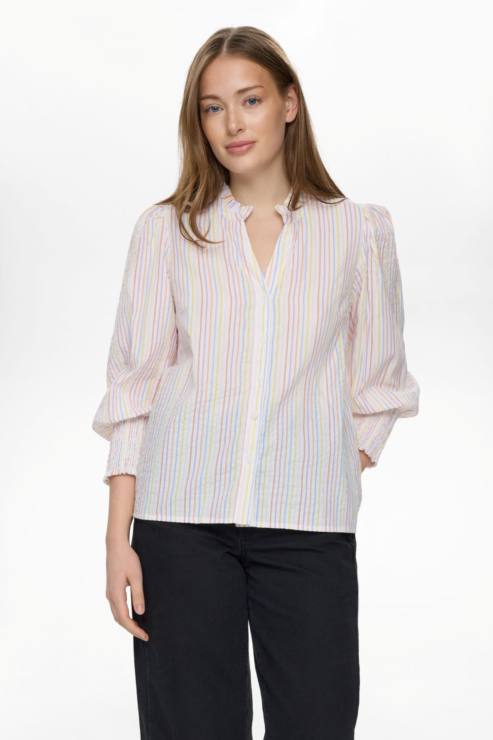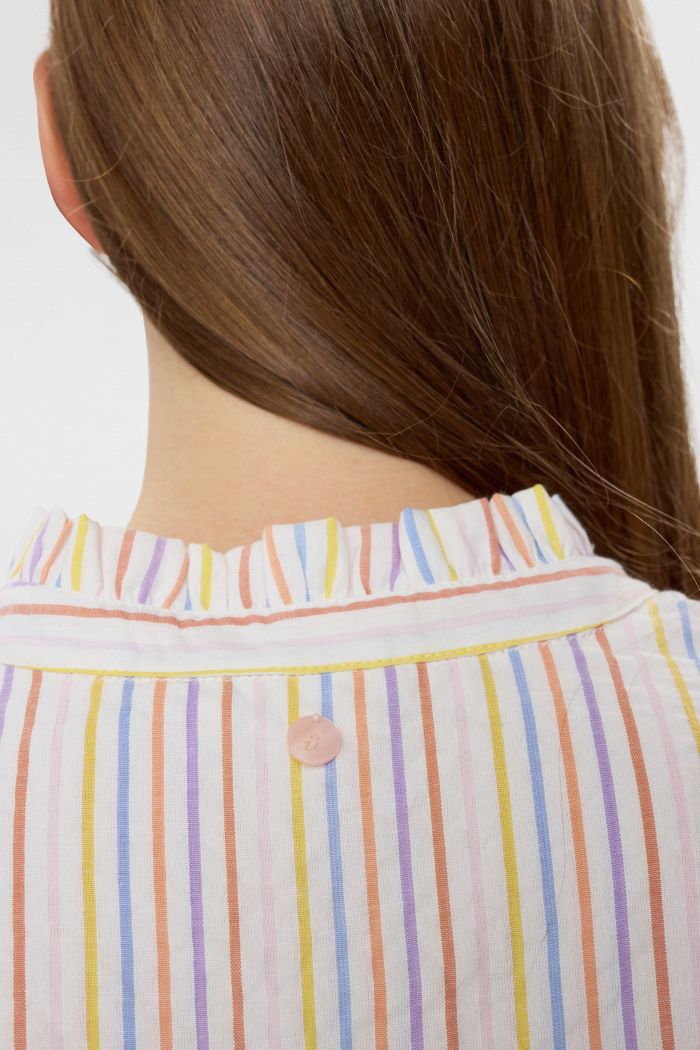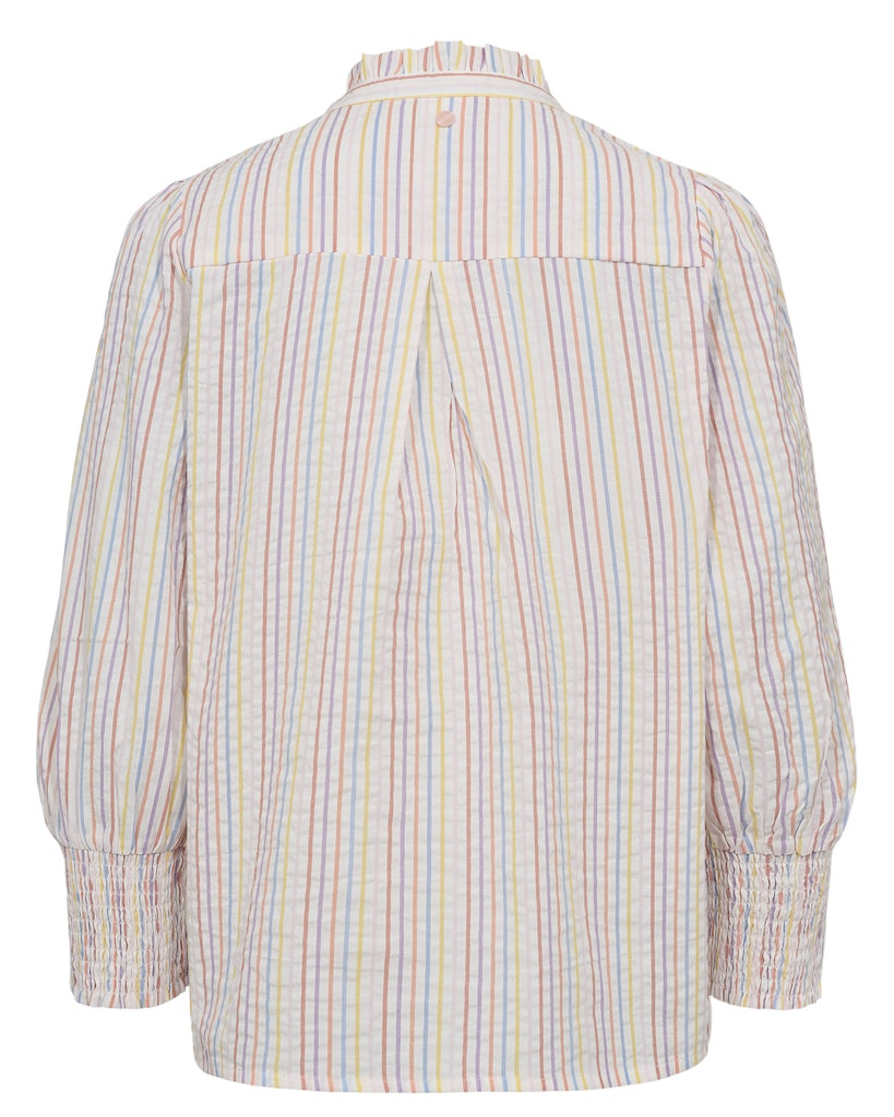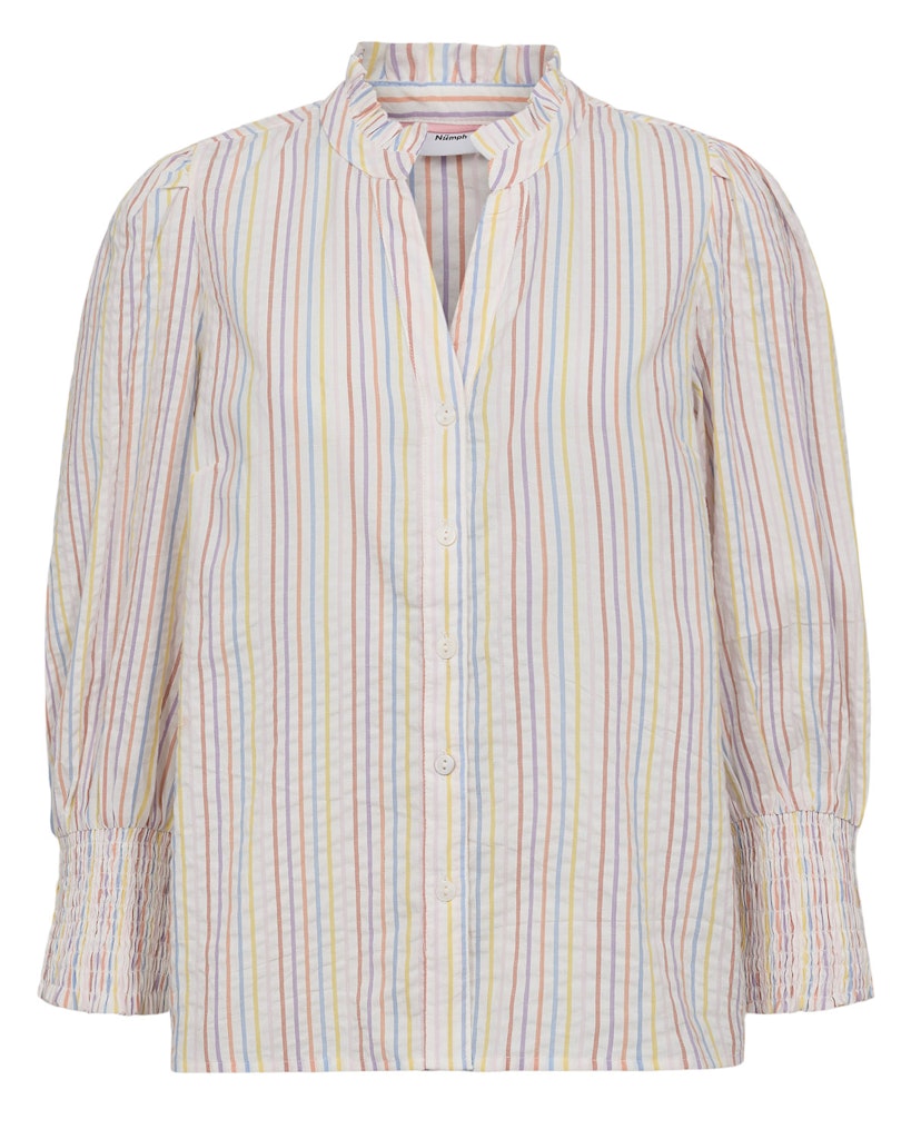 En klassisk og feminin skjorte fra Nümph med fine, lodrette striber i bløde pastelfarver. Skjorten har en lille V-udskæring med en elegant krølledetalje i halsen, som giver et let og feminint udtryk. Den er gennemknappet foran og nem at style både åben og lukket.