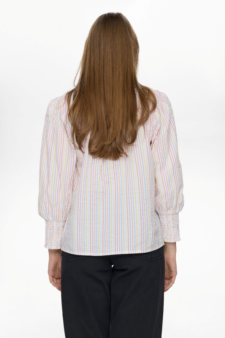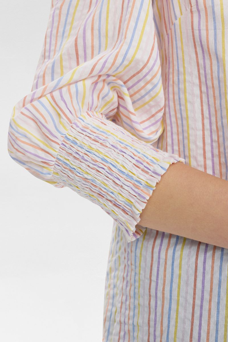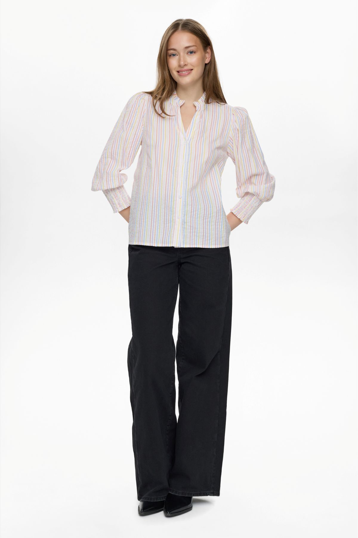 En klassisk og feminin skjorte fra Nümph med fine, lodrette striber i bløde pastelfarver. Skjorten har en lille V-udskæring med en elegant krølledetalje i halsen, som giver et let og feminint udtryk. Den er gennemknappet foran og nem at style både åben og lukket.