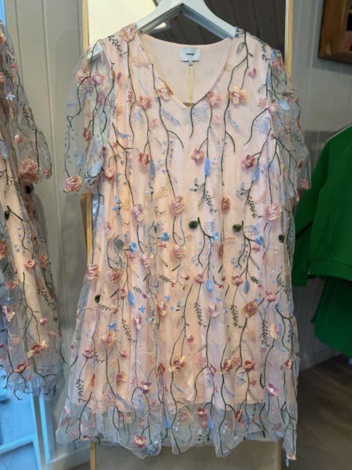 Flot og festlig kjole i et let og elegant design. Kjolen er dekoreret med smukt broderede blomsterranker i bløde pastelfarver, som ligger fint på den let transparente overflade og giver et romantisk og gennemført udtryk.