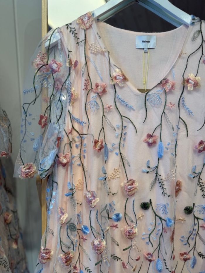 Det gennemsigtige yderstof er kombineret med en let underkjole i en blød viskoseblend i en sart lyserød nuance, som sikrer både komfort og et smukt fald. De korte ærmer er uden foer, hvilket giver en fin, feminin lethed og lader broderiet stå tydeligt frem.
