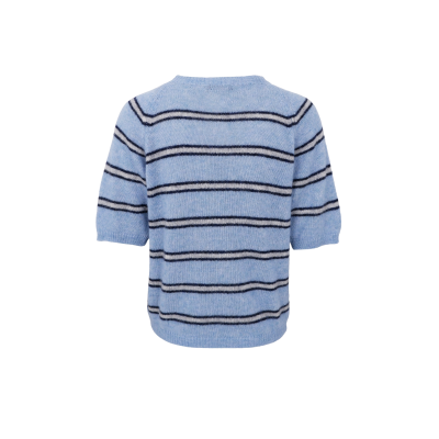 Blusen er designet med klædelige raglanærmer og fine striber, der giver et levende, men stadig roligt udtryk. Den har rund hals, og ribkanter ved hals, ærmer og bund skaber en pæn og harmonisk afslutning.