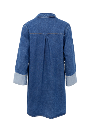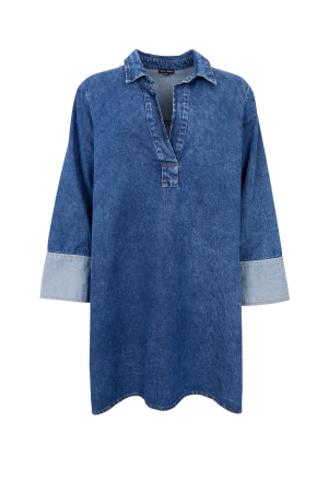 En skøn tunikakjole i 100% denim bomuld – en kvalitet, der føles blød, men samtidig har den helt rigtige struktur. Modellen er enkel og lige i snittet, hvilket gør den utrolig nem at bruge og klædelig på mange kropstyper.