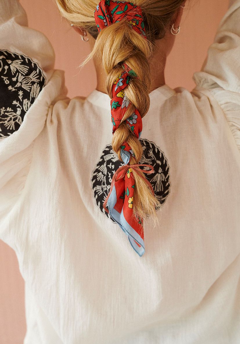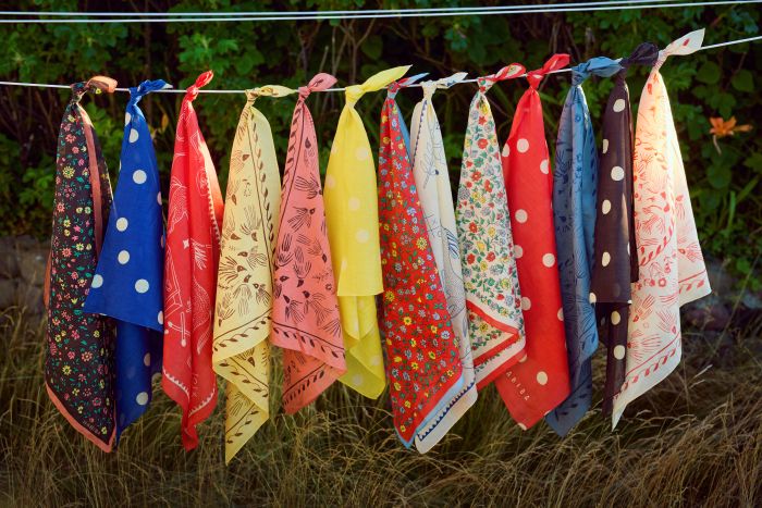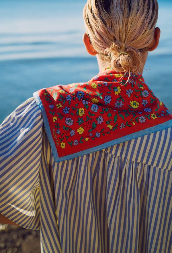 HILMA BANDANA er et lille styling-item med stor effekt. Brug den klassisk om halsen, bind den i håret, læg den i brystlommen, om taskens hank eller cykelkurven – eller vikl den om håndleddet som et personligt twist. Et alsidigt tørklæde, der nemt kan bruges året rundt og tilfører farve og stemning til både hverdag og ferieliv.