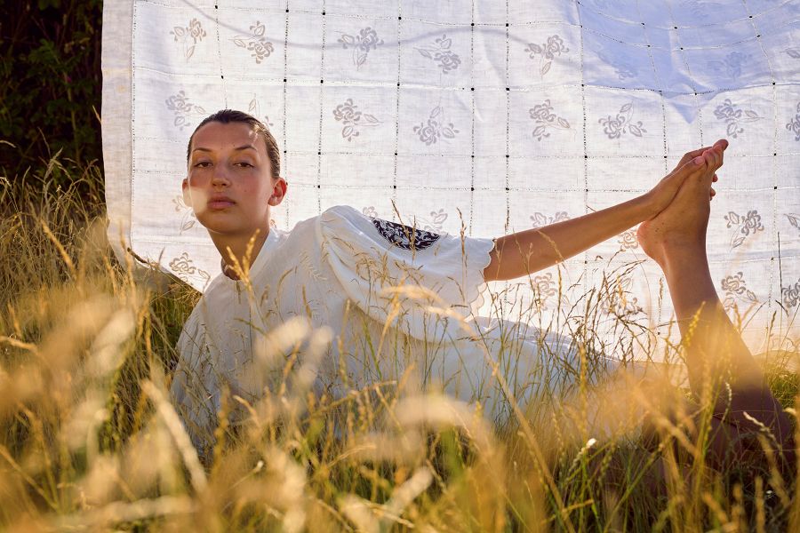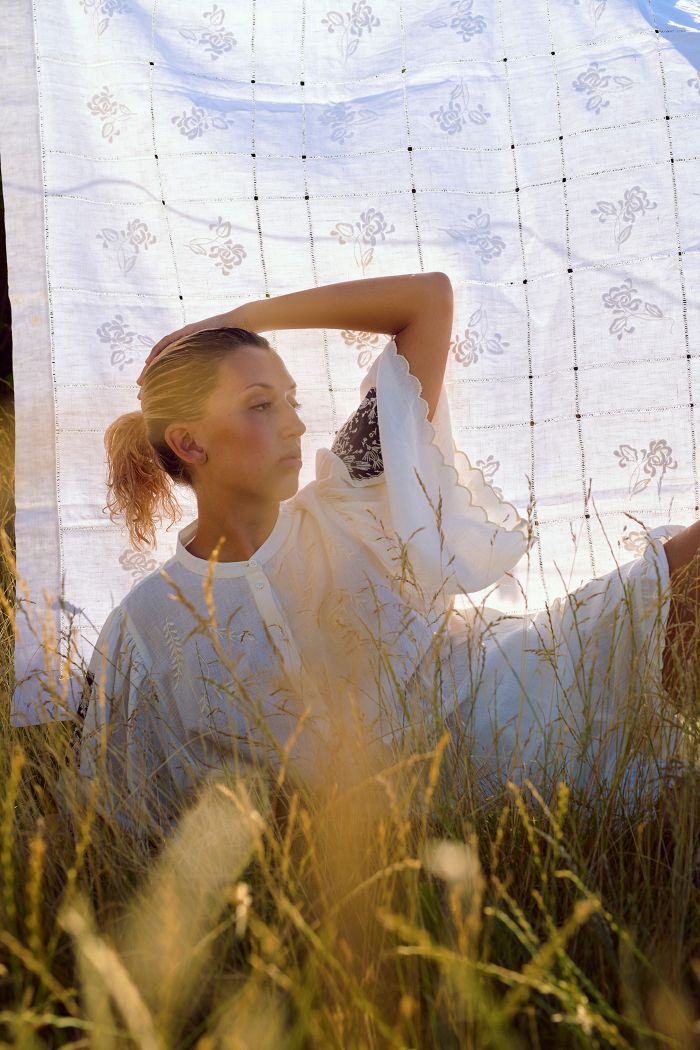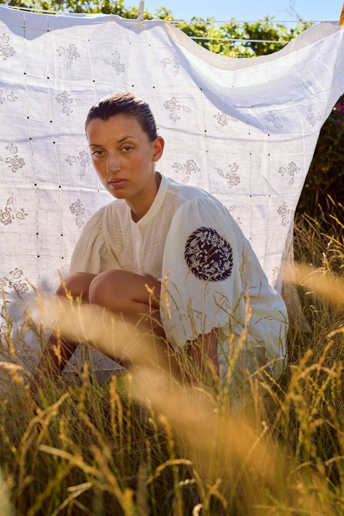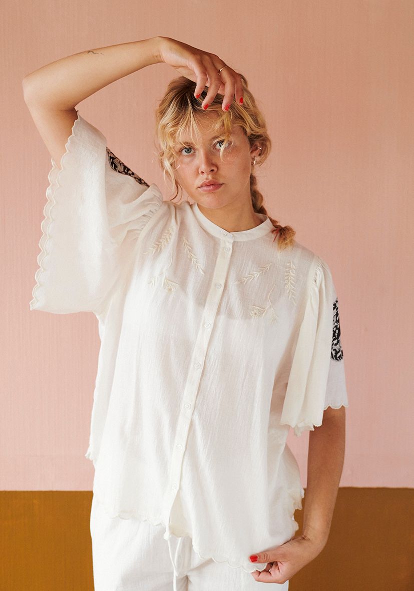På ærmerne prydes skjorten af smukke broderede lapper i kontrastfarver, ligesom der er et større broderi på ryggen og tone‑i‑tone broderier på brystet. Broderierne er inspireret af Rumænien, som har en lang og stærk tradition for netop broderihåndværk. Ærmerne og skjortens bund afsluttes med en fin bølget, broderet kant, som fuldender det gennemførte og håndlavede udtryk.