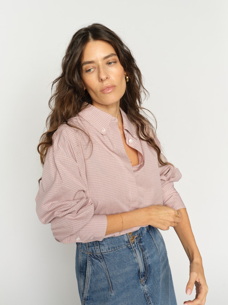 Småternet skjorte med fine, gennemarbejdede detaljer. Den klassiske ternede skjorte har her fået et moderne og feminint udtryk med bittesmå tern i rosa, der giver et let og elegant spil i stoffet. Skjorten har spids krave med fine knapper, mens den skjulte knaplukning foran giver et stilrent og roligt look.