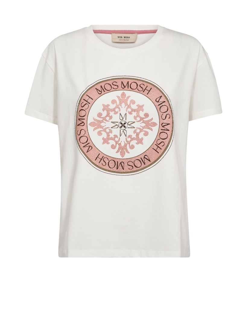 Klassisk T-shirt i en blød og behagelig kvalitet med et elegant, rundt MOS MOSH-print på fronten. Skriften er fin og diskret og giver T-shirten et stilrent udtryk med det lille ekstra. Modellen har rund hals, korte ærmer og en regular pasform, der falder flot på kroppen.