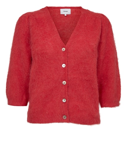 Feminin cardigan fra Nümph i en smuk, klar rød nuance, der giver garderoben et frisk og levende løft. Strikken er brushed – let opkradset i overfladen – hvilket giver et blødt, luftigt og eksklusivt udtryk.